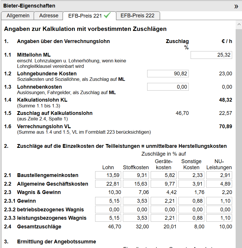 Die Formblätter 221 oder 222 (je nach gewähltem Kalkulationsverfahren) enthalten Angaben zur Ermittlung der Angebotssumme des abgegebenen Angebots. Also zu Kalkulationswerten wie Lohn, Umlagen und Kostenarten bei Zuschlagskalkulation (221) oder Endsummenkalkulation (222).