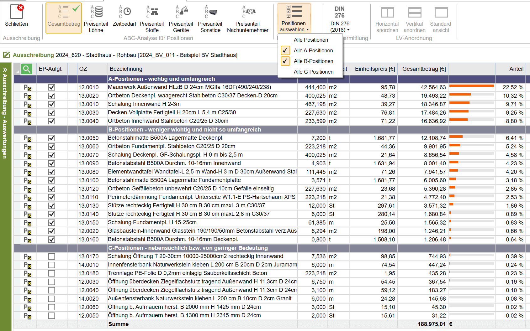 In der Regel bestimmen 20 % der Positionen eines Leistungsverzeichnisses 80 % der Angebotssumme. Mit Eingrenzung auf diese Positionen können sowohl Bieter als auch Ausschreibende sich beim Ausfüllen und Auswerten auf das Wesentliche konzentrieren. So bleibt der Aufwand für beide Seiten überschaubar. Voraussetzung dafür ist allerdings eine Betrachtung des gesamten Leistungsverzeichnisses im Sinne einer ABC-Analyse.