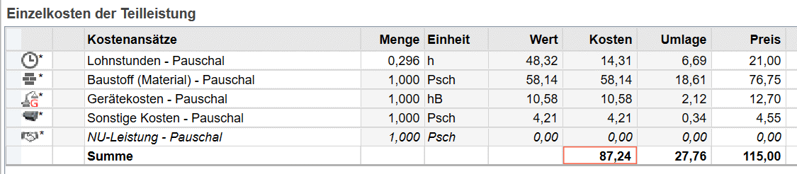 Die Summe 3 – Umlage auf die Einzelkosten – setzt sich zusammen aus der Summe der Baustellengemeinkosten, der Summe der Allgemeinen Geschäftskosten und der Summe für Wagnis und Gewinn, die im Angebot kalkuliert wurden.
