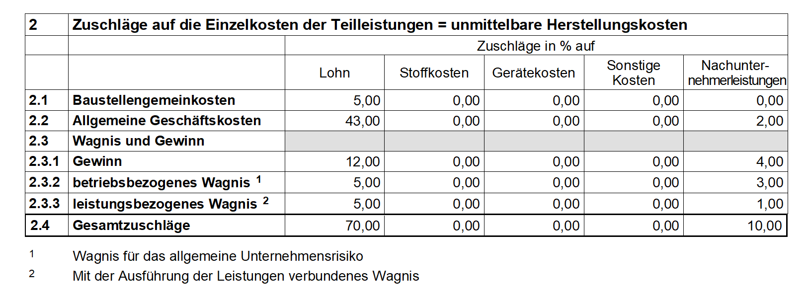 Dabei werden sämtliche Gemeinkosten sowie Gewinn und Wagnisse ausschließlich auf den Lohn verrechnet. Im Abschnitt 2 des Formblatts sind prozentuale Zuschläge nur in der Spalte „Lohn“ einzutragen. Für alle anderen Kostenarten außer Nachunternehmerleistungen (soweit diese anfallen) werden die Werte jeweils mit „0“ angesetzt.
