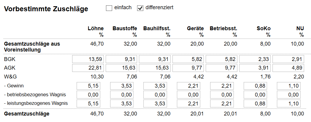 Die Gesamtzuschläge zu den Einzelkosten für Lohn, Stoffe, Geräte, Sonstige und NU-Leistungen in der letzten Zeile des Abschnitts 2 ergeben sich als Summe der jeweiligen Prozentwerte bei Baustellengemeinkosten, Allgemeine Geschäftskosten, Gewinn sowie betriebsbezogenes und leistungsbezogenes Wagnis. Diese Gesamtzuschläge kommen im Abschnitt 3 bei der Ermittlung der Angebotssumme als prozentuale Zuschläge auf die Einzelkosten der Teilleistungen zum Ansatz.