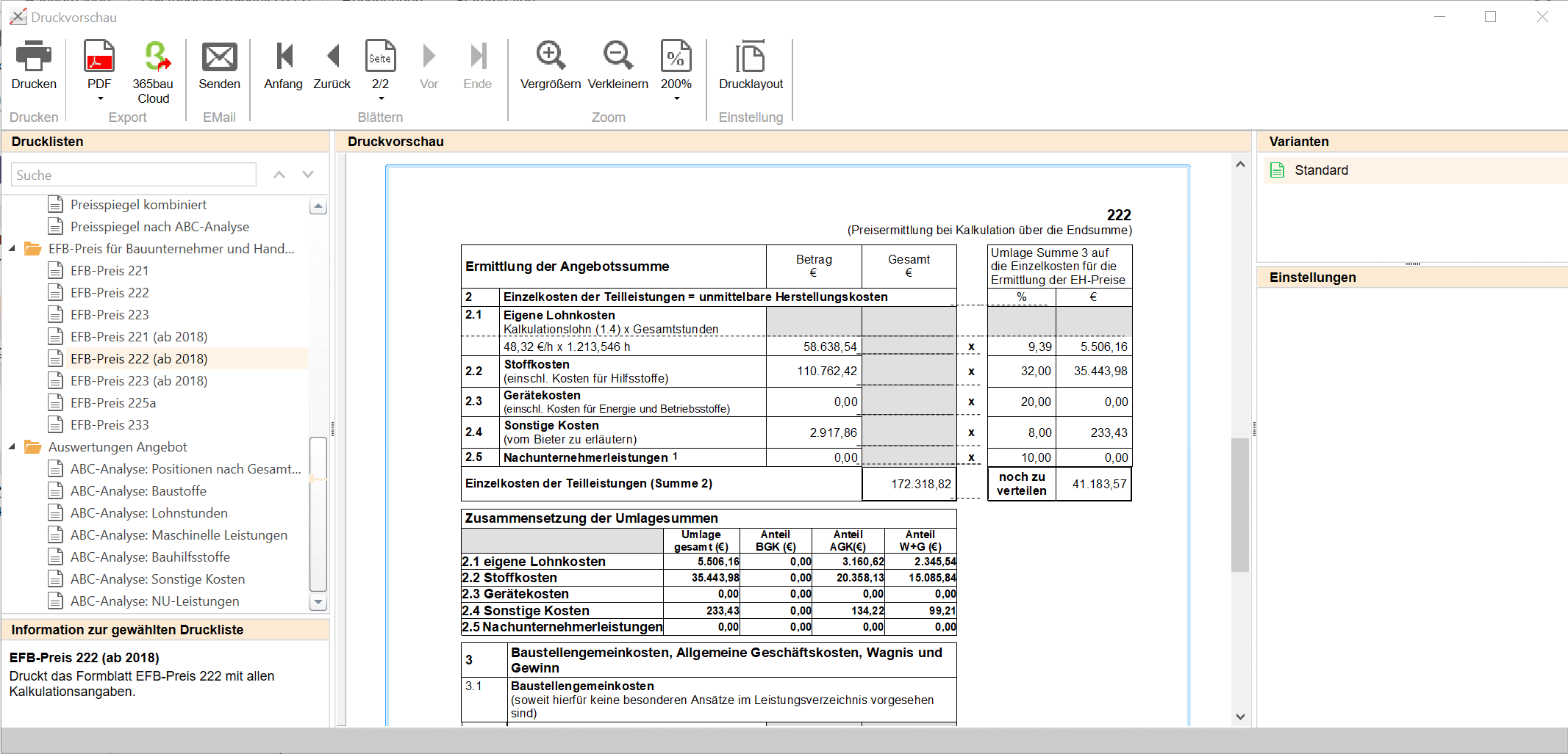 Das Formblatt ist unabhängig vom verwendeten Kalkulationsverfahren. Es muss aber auf die Übereinstimmung mit den Angaben auf Formblatt 221 und 222 – insbesondere beim Verrechnungslohn und bei den Umlagen – geachtet werden. Rechnerische Widersprüche lassen sich von der prüfenden Stelle leicht erkennen.