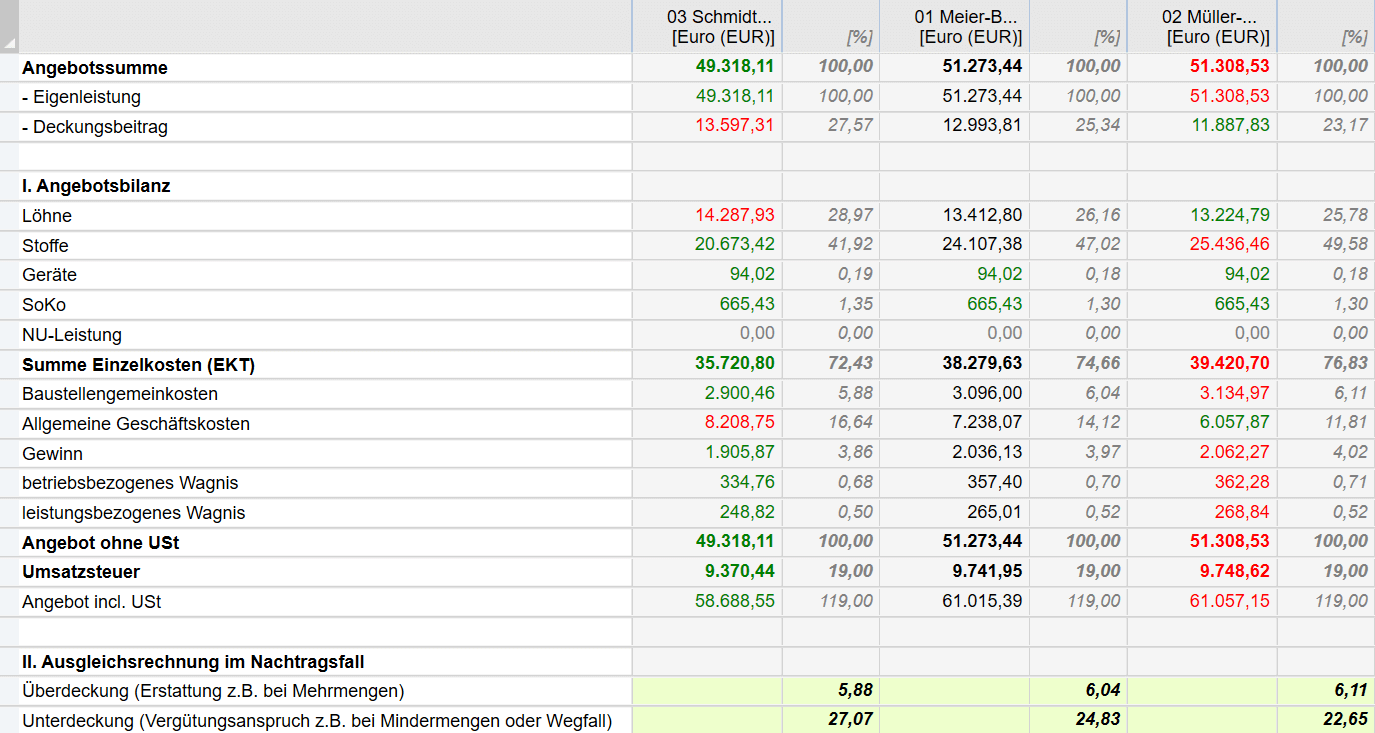 So ergeben sich die Anteile der Angebotssumme für eigene Lohnkosten, Stoffkosten, Gerätekosten, Sonstige Kosten und Nachunternehmerleistungen jeweils als Euro-Betrag. Die Summe dieser Euro-Beträge entspricht der Angebotssumme.